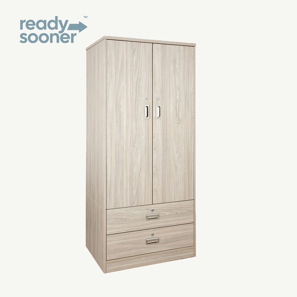 Tough Plus Double Wardrobe with 2 Drawers & Key locks – constructed from 18mm MDF with a wipe clean melamine finish with ligature-reduction inset handles, inset doors with heavy duty strip hinges and 2 drawers beneath featuring a 40kg rated drawer runner and hardened steel restraints to prevent drawers being removed. Inside features half hanging space including a grooved clothes hanging shelf for ligature reduction and 4 shelf compartments for bedroom storage. Designed for low and medium secure accommodation. This item is delivered in sections then bolted together on site by our delivery team.